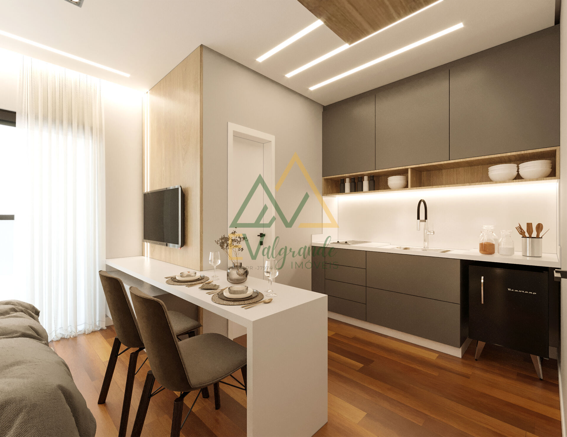 1 Dormitório, sendo 1 suíte1 Banheiro1 Copa1 Cozinha